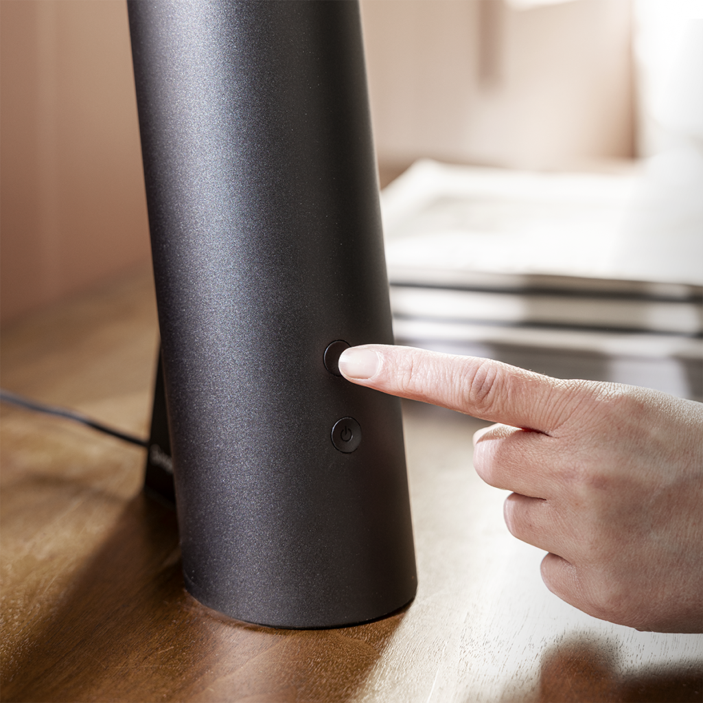 Pisano is a large table lamp that plays with the balance of shapes, featuring a broad luminous surface that you can easily control with a touch, directly on the inclined base. »